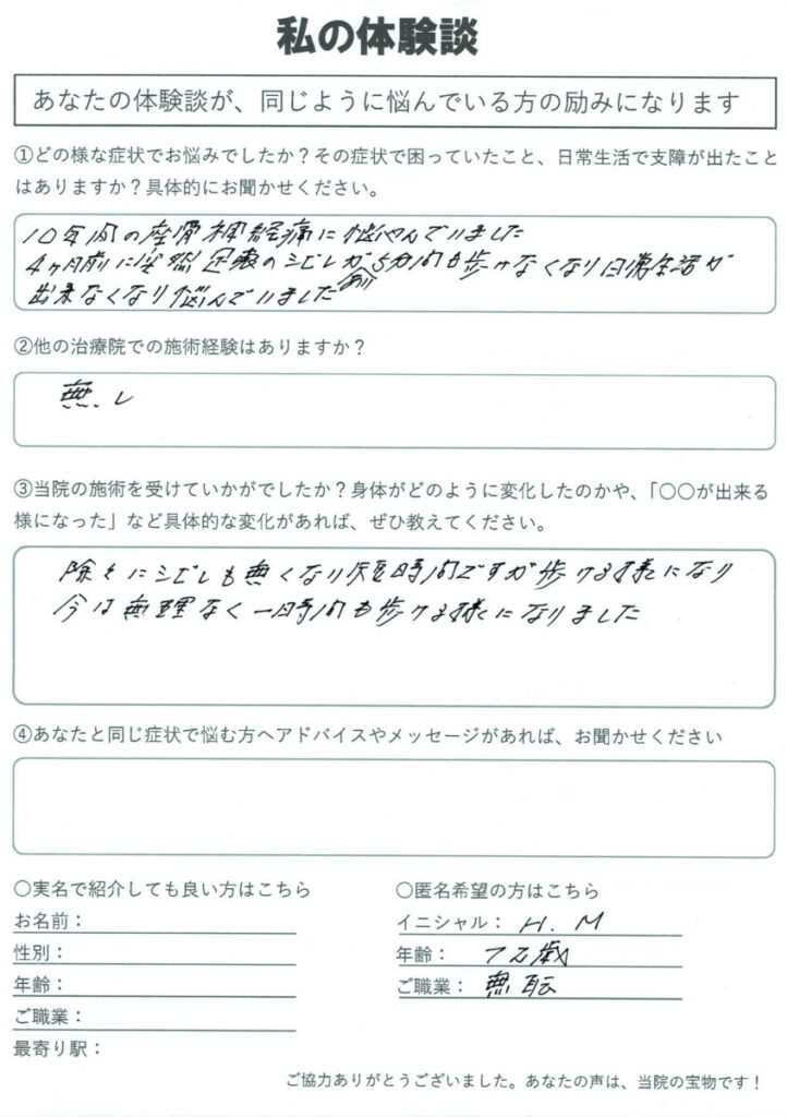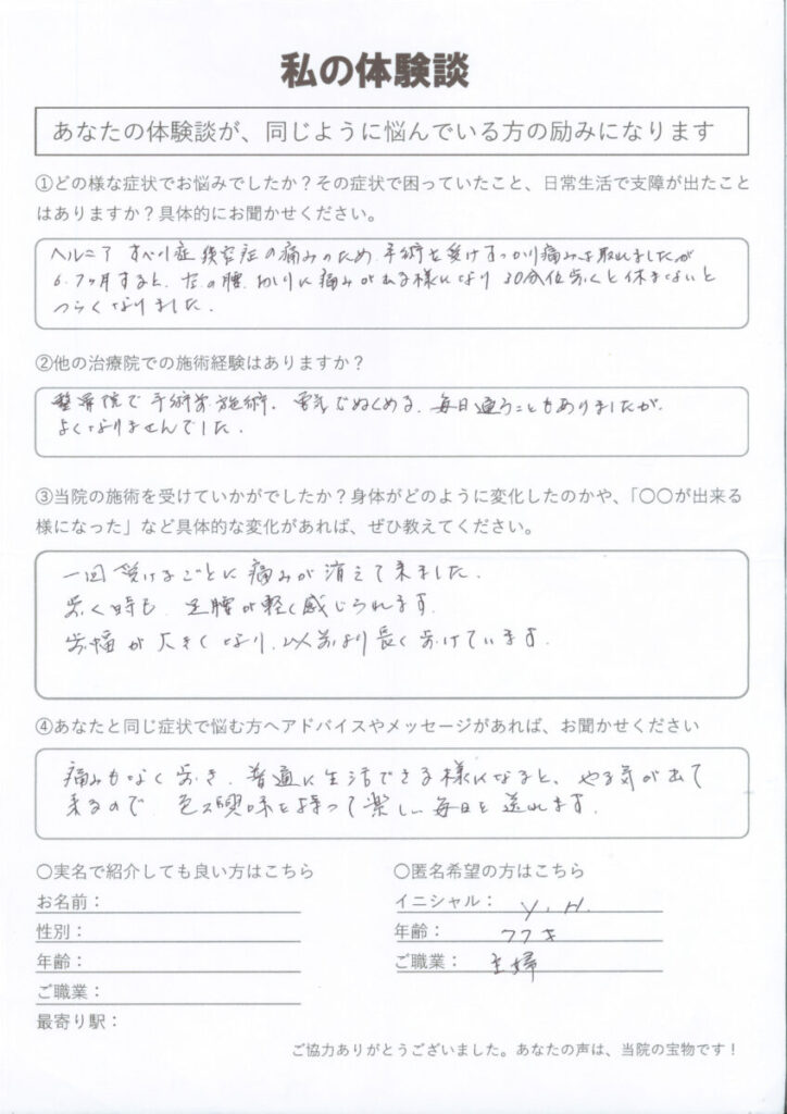 腰にヘルニア、坐骨神経痛による腰の痛み、足の痺れで歩行困難になり、自分で靴下を履く事も、一人でお風呂に入る事もできませんでした。