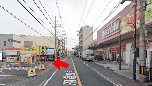 マックスバリューさん向かいの有料コインパーキングに駐車して下さい。